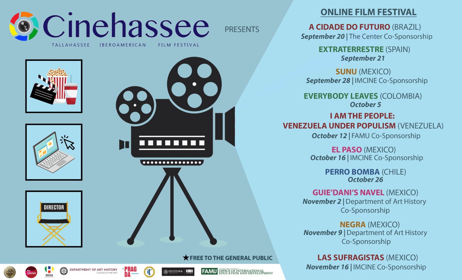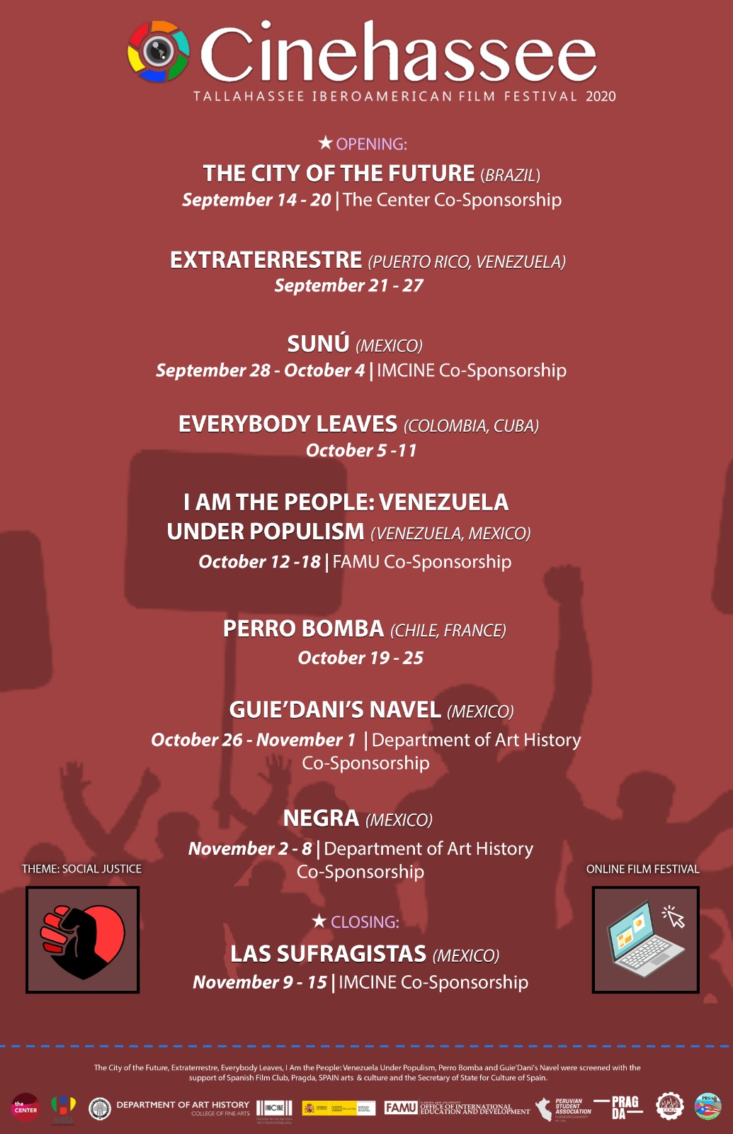 Cinehassee streams a series of films from Hispanic countries, as well as those that address topics related to the Hispanic culture. The main goal of the Festival is to provide multiple viewpoints, inform, discuss, and address complex social issues, strengthen ties between our diverse community, and raise awareness on issues concerning the characteristics, importance, and impact of the Hispanic people and their idiosyncrasy.